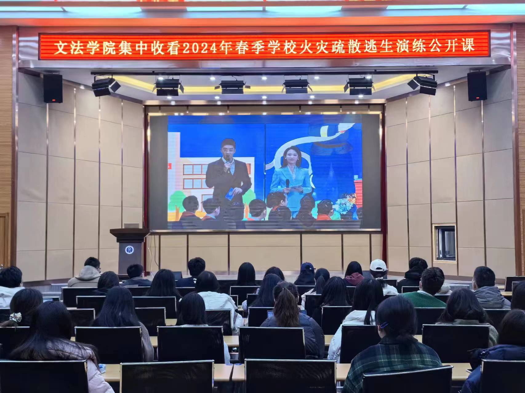 2024年3月15日上午,糖心视频 于文管学馆A210会议室、B230会议室组织师生集中收看2024年春季学校火灾疏散逃生演练公开课。